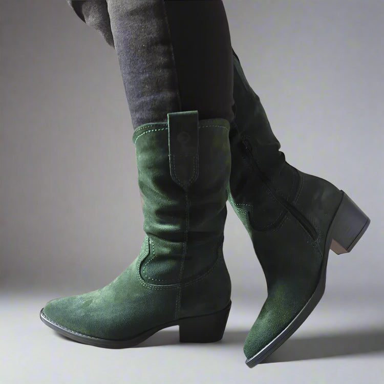 Cizme casual de damă Tamaris, realizate din piele naturală întoarsă de culoare verde velur, perfecte pentru sezonul rece. Designul elegant și culoarea distinctă le fac ideale pentru ținute casual sau de zi cu zi.