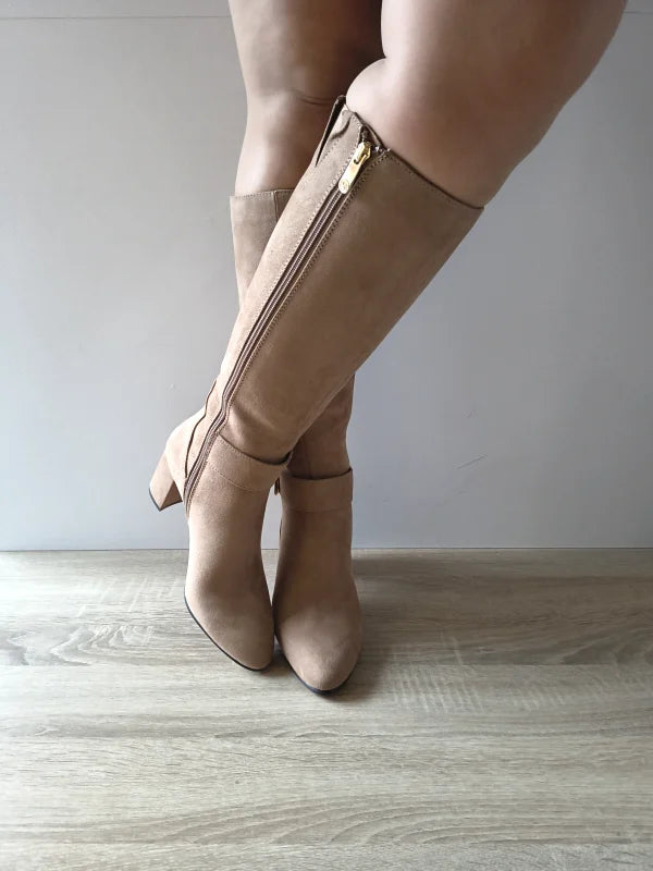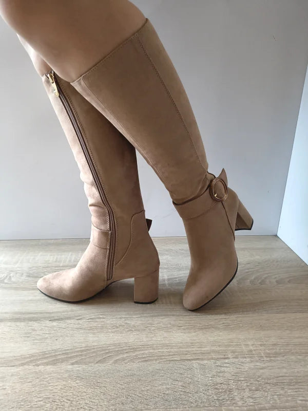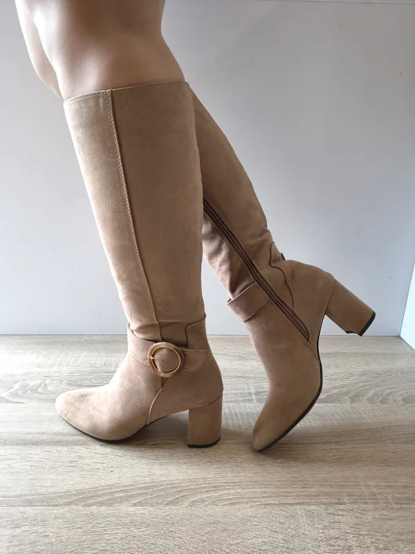 Cizme elegante de damă realizate din piele ecologică velur, cu un aspect cald și rafinat în nuanță bej. Modelul se distinge prin inelul decorativ auriu din zona gleznei, un detaliu feminin care evidențiază frumos linia piciorului. Tocul stabil oferă eleganță și confort la purtare, iar fermoarul lateral asigură încălțare ușoară.