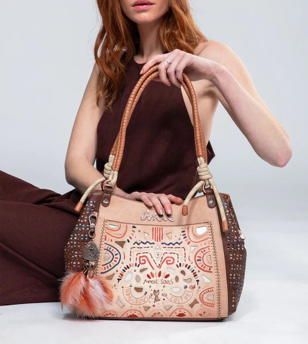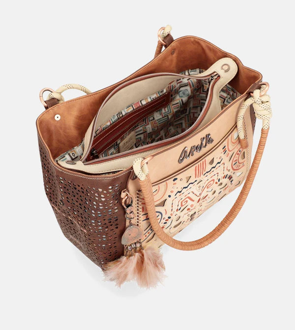 Partea din față a acestei genți este inspirată din măștile caracteristice culturii amazoniene.Prin suprapunerea materialelor, decupaj și broderie colorată, este reprezentată o mască tribală originală.Laturile sunt din material decupat in ton maro suprapus imprimeuului multicolor al colectiei.Spatele prezintă o țesătură simplă și un petic din colecție.