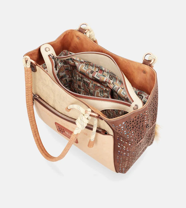Această geantă tote Tribe cu mânere împletite face parte din colecția Anekke Menire, un tribut adus grupurilor de femei indigene din Amazon.
