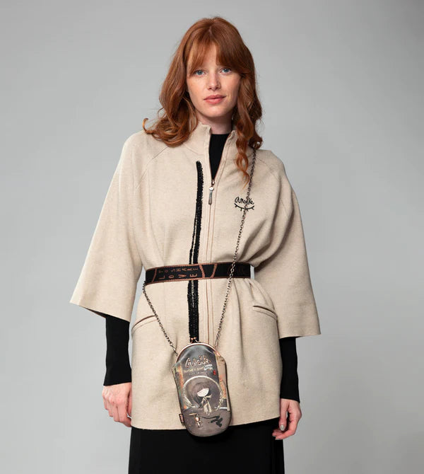Această husă originală pentru ochelari este de dimensiuni medii-mice și îți va permite să o folosești atât pentru a-ți depozita ochelarii, cât și ca geantă de umăr pentru a purta telefonul mobil.Are o notă originală de epocă, datorită închizătoarei duzei și mânerului din lanț metalic și interiorului căptușit.