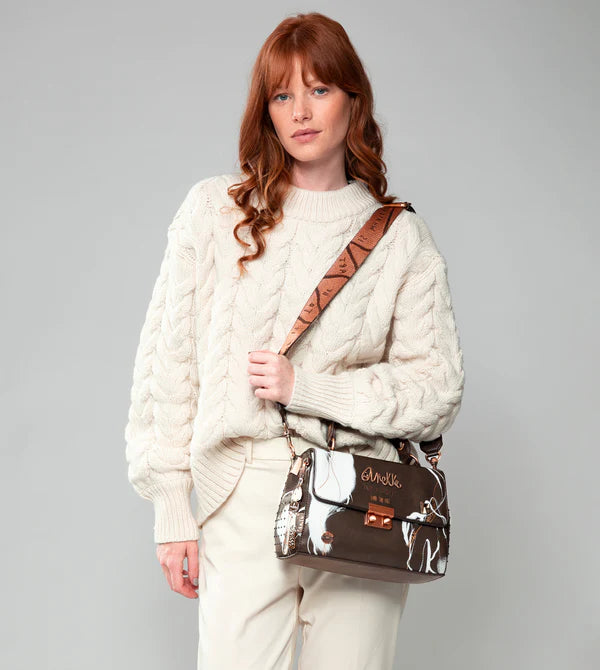 Această geantă maro cu clapă Anekke Nature Shodō are 3 compartimente separate în interior.Este de dimensiuni medii-mare și are un buzunar la spate.Geanta are o curea de mână plus o curea de umăr care poate fi ajustată la diferite lungimi.Interiorul este captusit si are 3 compartimente, cel central cu inchidere cu fermoar.