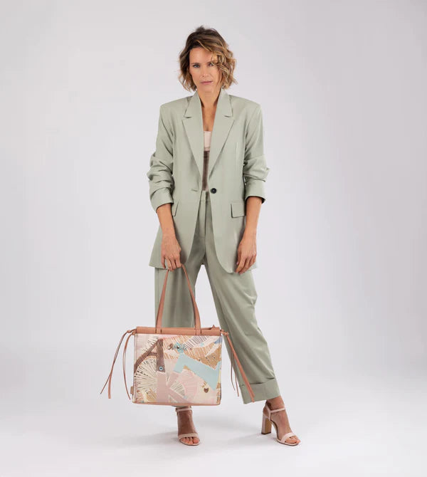 Această geantă din linia Passion face parte din colecția Anekke Hollywood și se caracterizează prin tonurile sale moi combinate în diferite blocuri, cu tăieturi și broderii care generează volume pe imprimeuri originale. Această geantă originală combină o tehnică diferită pe fiecare parte: tăiere și broderie pe față, iar spatele cu inscripții, permițându-ți să o folosești pe ambele părți.