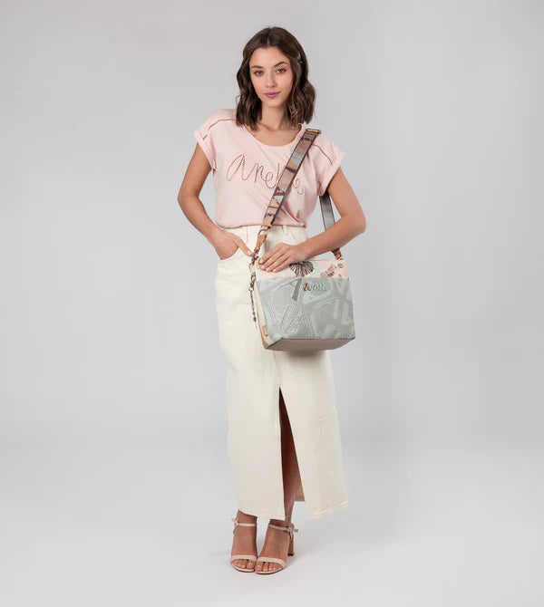 Aceasta este o geantă de dimensiuni mari, cu buzunare în față și în spate. Interiorul este captusit si are buzunare. Mânerul este o curea de umăr reglabilă la diferite lungimi, perfectă pentru a o adapta la înălțimea preferată.