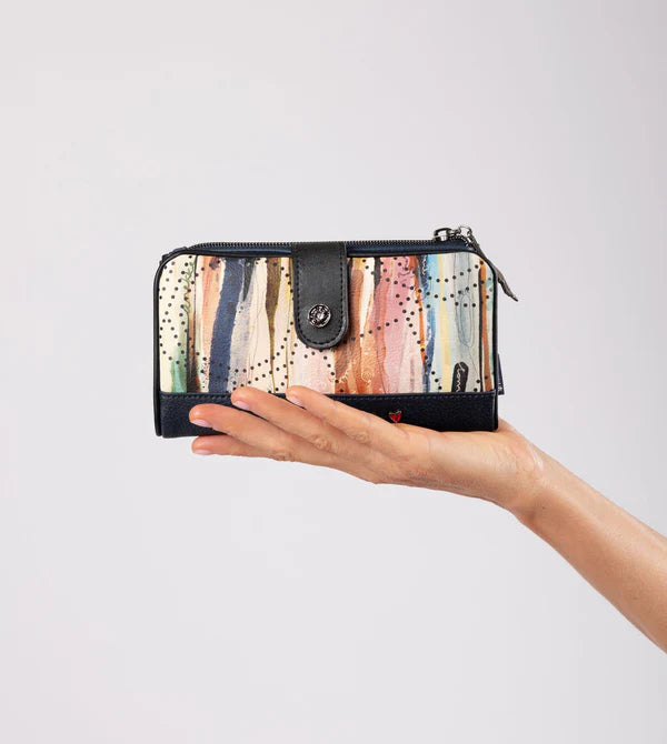 Este un portofel de dimensiuni mari. Materialul cu care este realizat este flexibil. Are doua compartimente principale: spatele, unde vei gasi un portofel mare si spatiu pentru facturi sau documente. În partea de sus are fermoar, iar în interior se pot depozita monede. Întregul interior este căptușit.