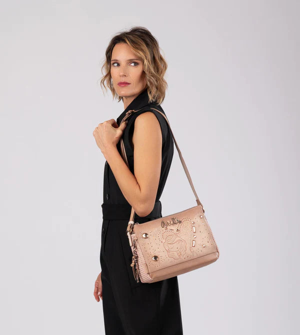 Glamourul vechiului Hollywood cuplat cu perseverența unui mare om de știință – aceasta este esența liniei Studio Nude din cadrul colecției Anekke Hollywood, inspirată de legendara actriță de film clasic Hedy Lamarr. Istoria acestei femei este plină de mari realizări, nu numai legate de cinema, ci și de o altă mare pasiune a ei, adică știința. Această femeie uimitoare, a fost inventatorul wifi-ului! Fiecare piesă din această linie de culori nude este ca o bijuterie unică: broderia creează diverse siluete și forme inspirate de cinema și știință, cu sute de decorațiuni precum strasuri, ace personalizate, aplicații metalice sau perle. Laturile și spatele colorate sunt un imprimeu inspirat de valurile generate de wifi. Pregătește-te să te bucuri de un accesoriu care spune povestea unei femei unice, gata să te facă să visezi în fiecare zi.
