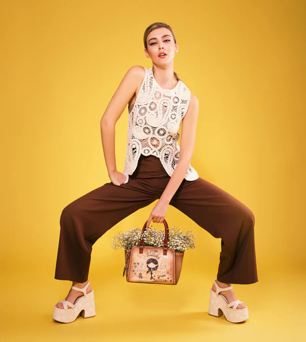 Ești gata să călătorești în vara dragostei cu Anekke Peace & Love? Incepem o calatorie unica in care vei avea nevoie doar de doua lucruri: imaginatie si cateva flori in par. Furgoneta lui Anekke decolează, așa că începem să călătorim pe Coasta de Vest a SUA într-o epocă unică: anii 60. Sub un soare cald și cu muzică, libertate și vise care vibrează sus, ne vom opri în Los Angeles, San Francisco și San Diego, pentru a experimenta mișcarea hippie din interior. Pregătește-te să te cufunzi într-o poveste unică prin fiecare detaliu al colecției: ace, broderii, forme tăiate și imprimeuri care ne vor readuce la această mișcare culturală. Veți găsi, de asemenea, patch-uri 100% personalizate și mesaje de împuternicire care vă vor face să curgeți. Această piesă face parte din linia de culoare cămilă, care combină nuanțe verzi, nud și roșiatice.