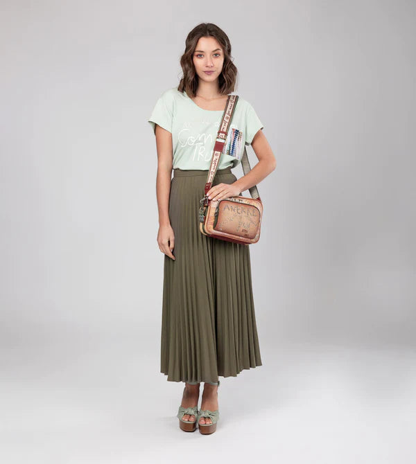 Această geantă de dimensiuni medii are 3 compartimente separate, toate cu închidere cu fermoar. Interiorul este căptușit și există buzunare exterioare atât pe față, cât și pe spate. Are o curea de umăr pentru agățat, reglabilă la diferite lungimi.