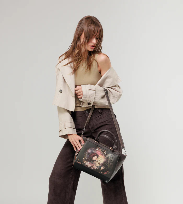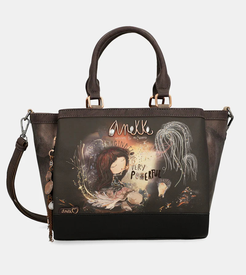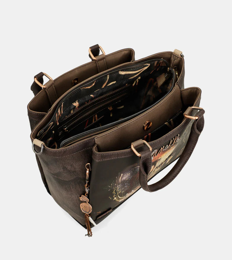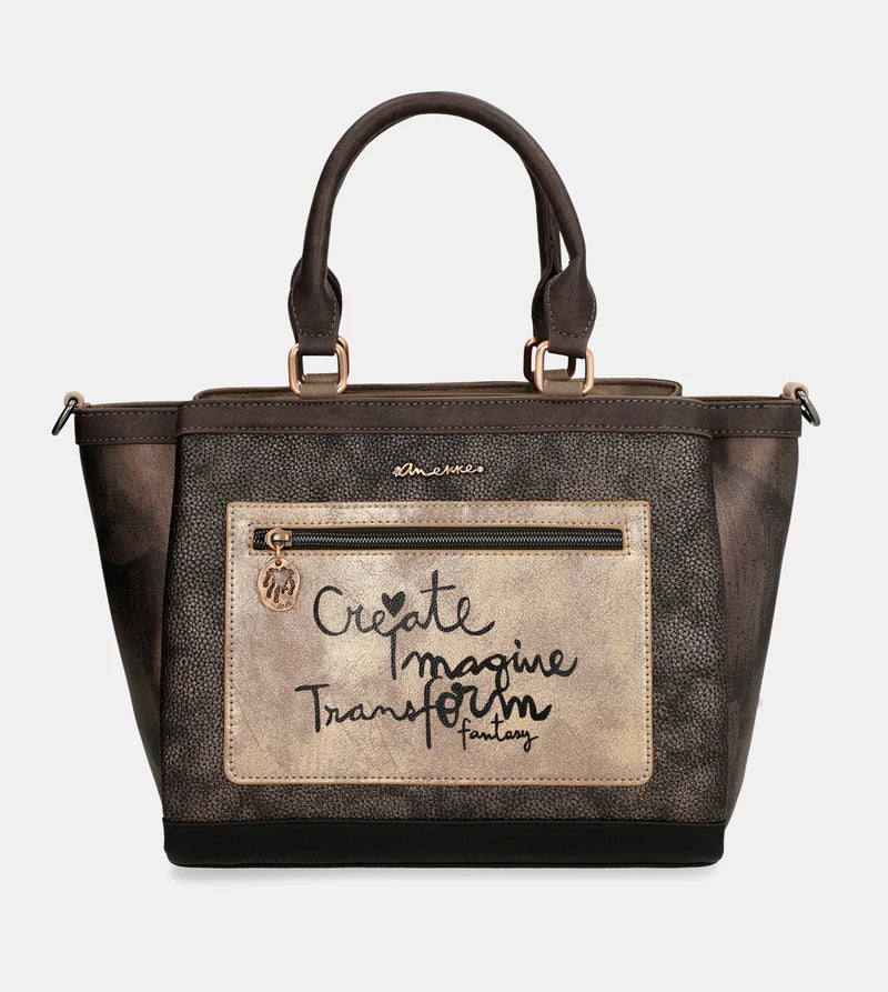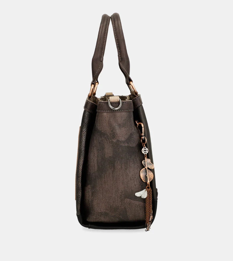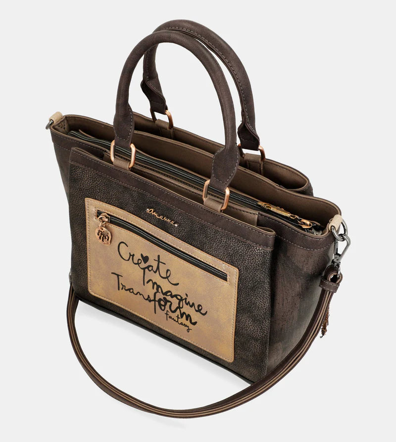 Această geantă de mână, care poate fi purtată și ca geantă crossbody, are 3 compartimente separate, este de dimensiuni medii-mare și are un buzunar la spate. Are două mânere și o curea de umăr reglabilă detașabilă. Interiorul este captusit si are buzunare. Atingerea finală sunt detaliile, făcându-l unic.