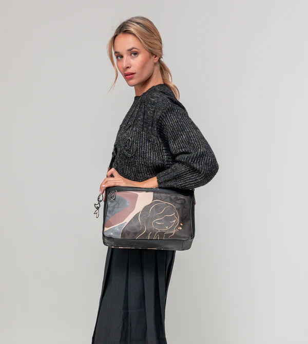 Designul sau original combina diferite elemente imprimate, peste care se suprapune silueta Anekke brodata cu fir metalic. Este un model moale și confortabil, perfect pentru a deveni noul tău inseparabil.