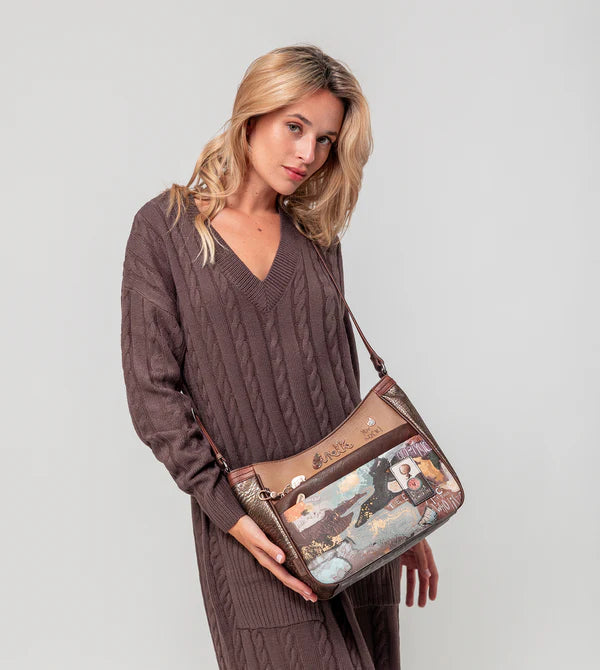 Este o geanta de umar mare imprimata, cu capacitate interioara mare. Se deschide cu fermoar în partea de sus, are căptușeală interioară și buzunare. In plus, are un buzunar exterior pe spate si fata. Cureaua de umăr este reglabilă la diferite lungimi, făcând-o perfectă pentru femeile de orice înălțime.