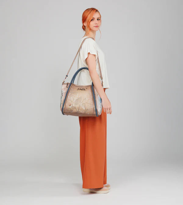 Această geantă tote de dimensiune mare este ideală pentru iubitoarele de genți spațioase, perfecte pentru orice ocazie. Dispune de două mânere pentru a fi purtată confortabil în mână, dar oferă și posibilitatea de a fi purtată pe umăr datorită bretelei reglabile și detașabile incluse. Interiorul este căptușit, iar organizarea este optimizată prin buzunare interioare și un buzunar exterior la spate.
