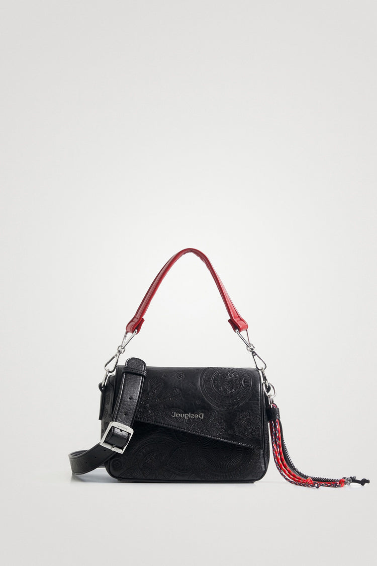 Geantă de mână originală din piele pe care o poți purta și încrucișată. Cu clapetă cu fermoar magnetic și fermoar, cu relief de frize pe toată suprafața sa. Înfrumusețare exterioară suspendată.