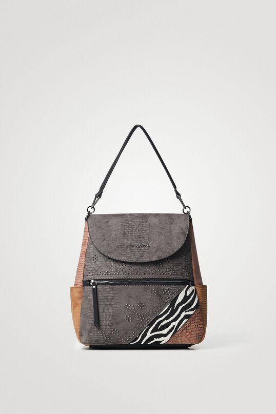Un rucsac care poate fi transportat ca atare și ca geantă, datorită curelei sale detașabile. Realizat în patch-uri de texturi, cu clapetă și compartimente exterioare.