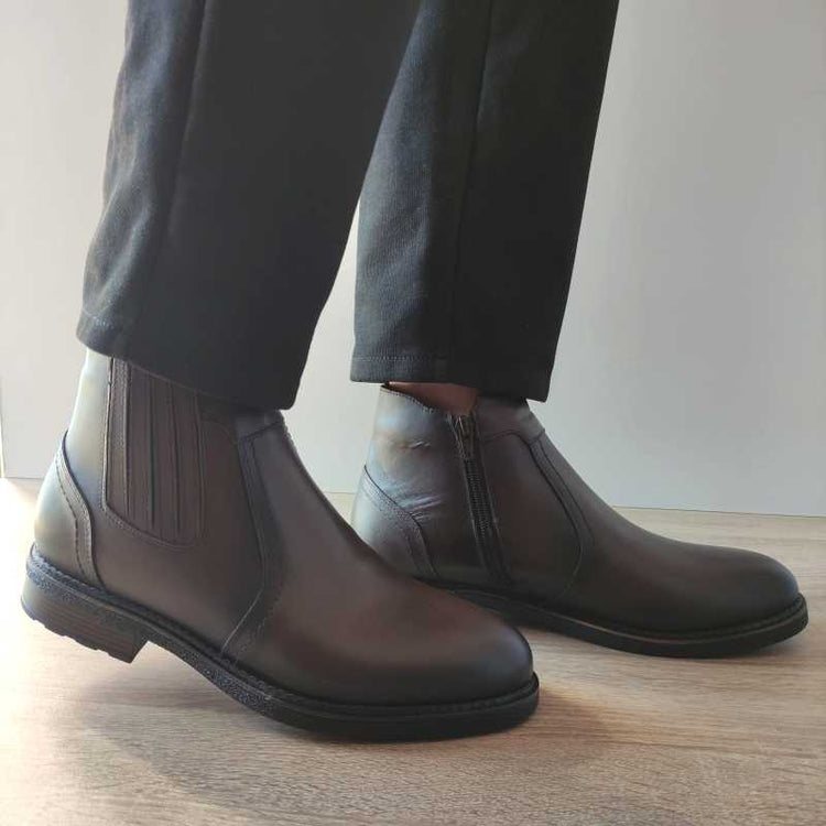 Ghete casual de bărbați din piele naturală, de culoare maro închis, ideale pentru un look elegant și confortabil în sezonul rece. Modelul dispune de fermoar lateral și de inserții elastice pentru o încălțare rapidă și o fixare optimă.