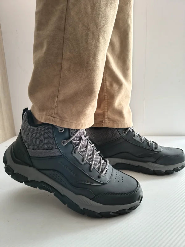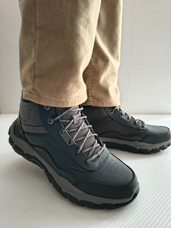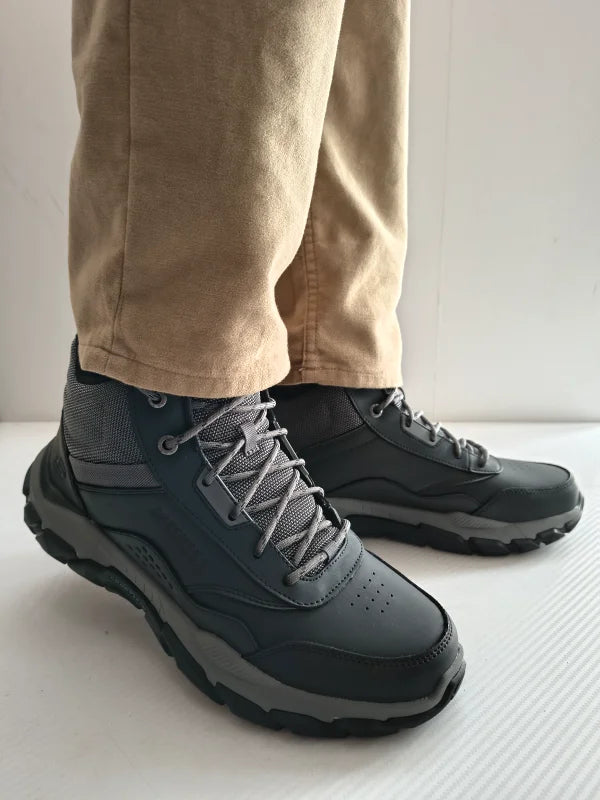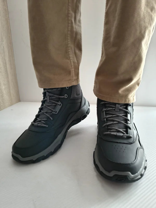 Ghetele Skechers 205587 BLK oferă un mix perfect între rezistență, confort și stil modern. Realizate din piele naturală combinată cu piele ecologică, sunt ideale pentru zilele reci, oferind protecție și durabilitate. Talpa cu tehnologie Goodyear asigură aderență excelentă și stabilitate pe orice teren, iar branțul cu Air-Cooled Memory Foam oferă confort moale și susținere pe toată durata purtării. Designul sport-casual le face potrivite atât pentru activități outdoor, cât și pentru ținutele urbane de zi cu zi.