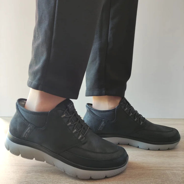 Ghete casual de bărbați Skechers, model Slip-ins, din piele ecologică, de culoare negru. Dotate cu tehnologia Memory Foam, aceste ghete oferă un confort sporit și sunt ideale pentru purtarea zilnică. Designul simplu, cu închidere Slip-ins, facilitează încălțarea rapidă, iar talpa robustă asigură stabilitate și aderență pe diverse suprafețe.