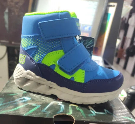 Aceste ghete Skechers aduc distracție și confort în pașii celor mici, datorită designului colorat și al luminilor integrate. Combinația de albastru intens cu detalii verde neon atrage imediat atenția, iar sistemul de închidere cu Velcro (scai) face încălțarea rapidă și ușoară.