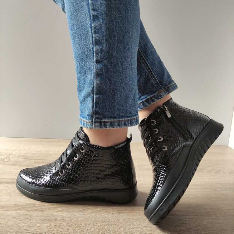 Descriere: Ghete casual din piele naturală lăcuită, cu finisaj croco în nuanță de negru, ideale pentru un look modern și elegant în zilele răcoroase. Sistemul de închidere cu fermoar lateral asigură o încălțare rapidă și confortabilă, iar șireturile adaugă un plus de stil. Talpa groasă de 3 cm oferă o bună stabilitate și amortizare, perfectă pentru plimbări îndelungate. Designul versatil se potrivește cu diverse ținute casual, adăugând un plus de rafinament.