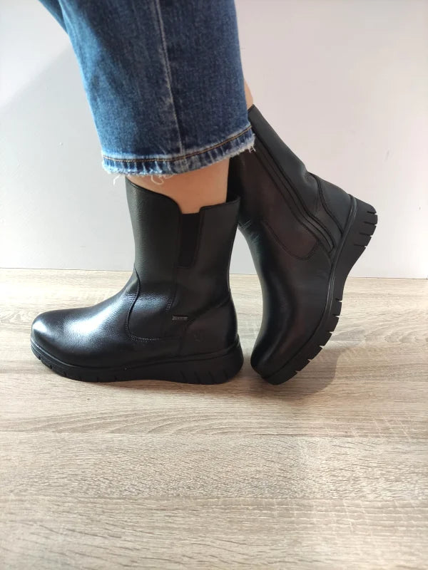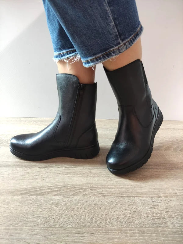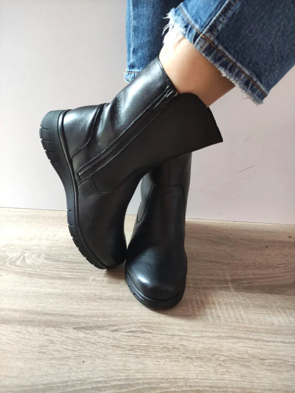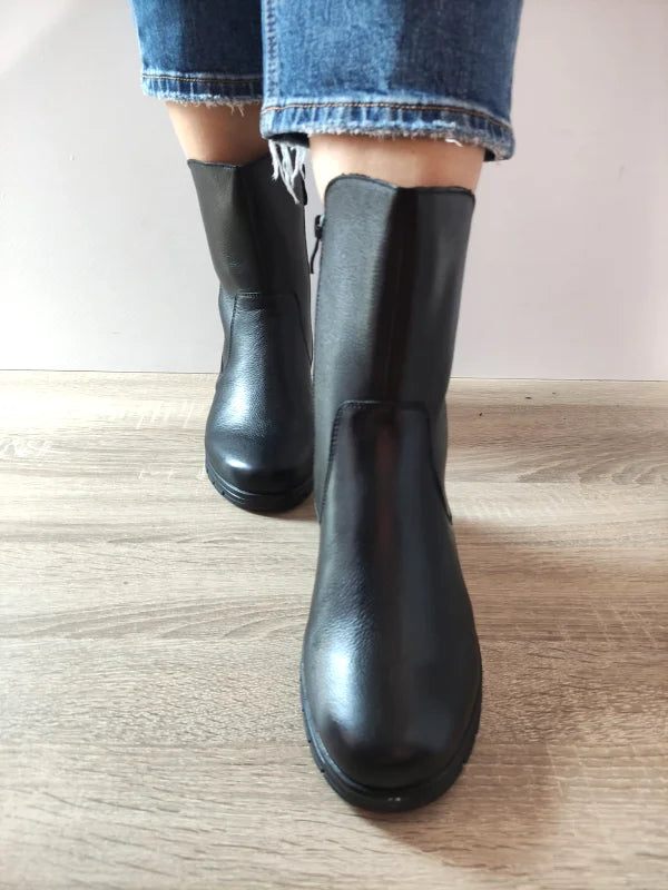 Modelul este prevăzut cu fermoar lateral pentru încălțare rapidă și comodă, menținând în același timp o linie elegantă și practică. Cu o înălțime totală de 22 cm și o talpă solidă de 4 cm la spate, aceste ghete asigură stabilitate, confort și izolare optimă în zilele friguroase.