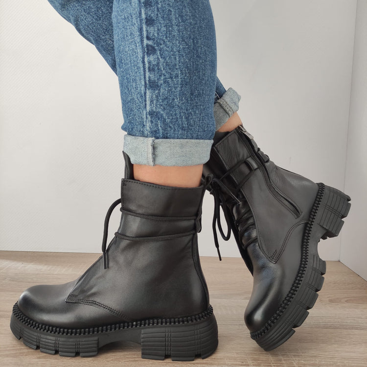 Fiecare detaliu a fost gândit cu atenție: de la închiderea cu fermoar, care facilitează încălțarea rapidă, până la talpa groasă de 4,5 centimetri, care oferă înălțime fără a compromite confortul. Înălțimea totală a ghetei de 21,5 centimetri îmbrățișează glezna, oferind suport și un look chic.
