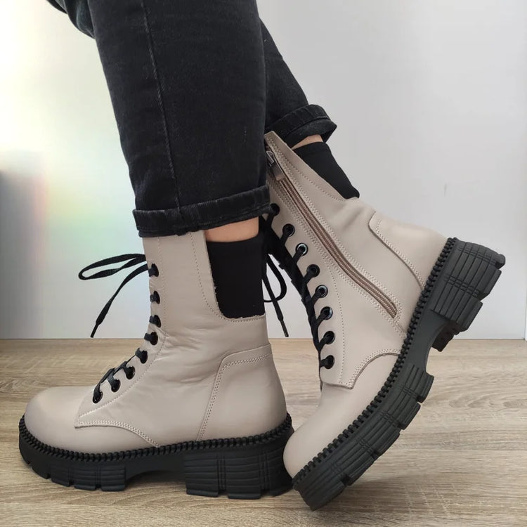 Ghete casual de damă marca Dogati, realizate din piele naturală, în nuanța bej vision. Aceste ghete se remarcă prin talpa robustă și designul modern, oferind un aspect îndrăzneț potrivit pentru stilul urban. Fermoarul lateral facilitează încălțarea, oferind confort și funcționalitate în fiecare zi.