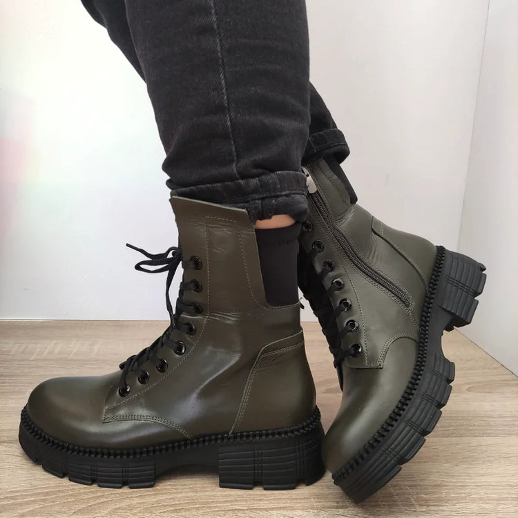 Ghete casual de damă marca Dogati, realizate din piele naturală, în nuanța verde kaki. Aceste ghete oferă un design robust și modern, cu talpă adânc profilată pentru stabilitate sporită. Fermoarul lateral facilitează încălțarea, fiind ideale pentru un stil urban confortabil și îndrăzneț.