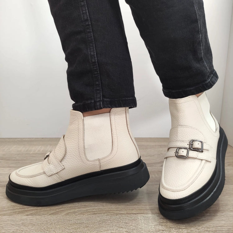 Descriere: Ghete casual pentru damă, marca Dogati, de culoare crem, confecționate din piele naturală, oferind un design elegant și modern. Aceste ghete se remarcă prin detaliile cu catarame decorative și prin stilul slip-on, ce include inserții elastice pentru o încălțare rapidă și confortabilă. Înălțimea totală a ghetei este de 15 cm, iar talpa groasă de 3.5 cm asigură stabilitate și confort pe durata întregii zile.