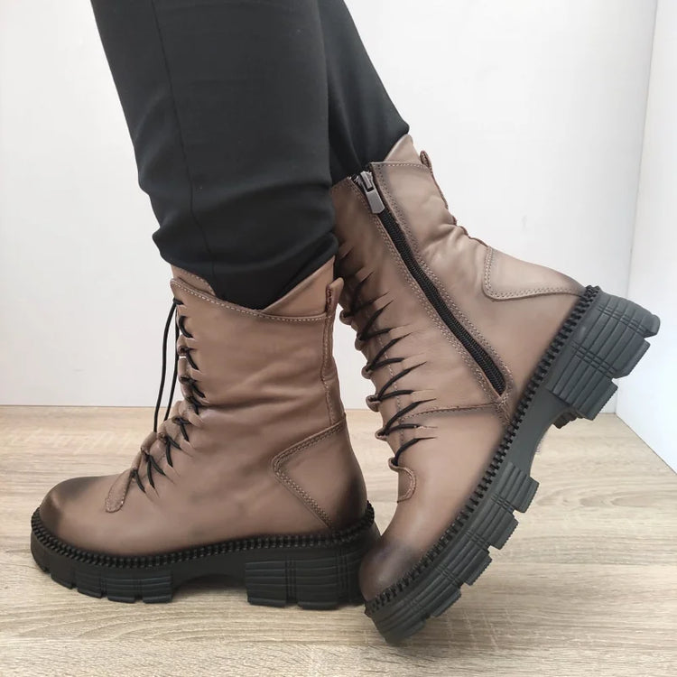 Descriere: Ghete casual de damă marca Dogati, realizate din piele naturală într-o nuanță elegantă de grej visone. Cu un design robust și detalii stilate, aceste ghete sunt potrivite pentru o ținută urbană modernă. Talpa de 4.5 cm oferă stabilitate și confort, iar fermoarul lateral și șireturile frontale adaugă funcționalitate și stil.