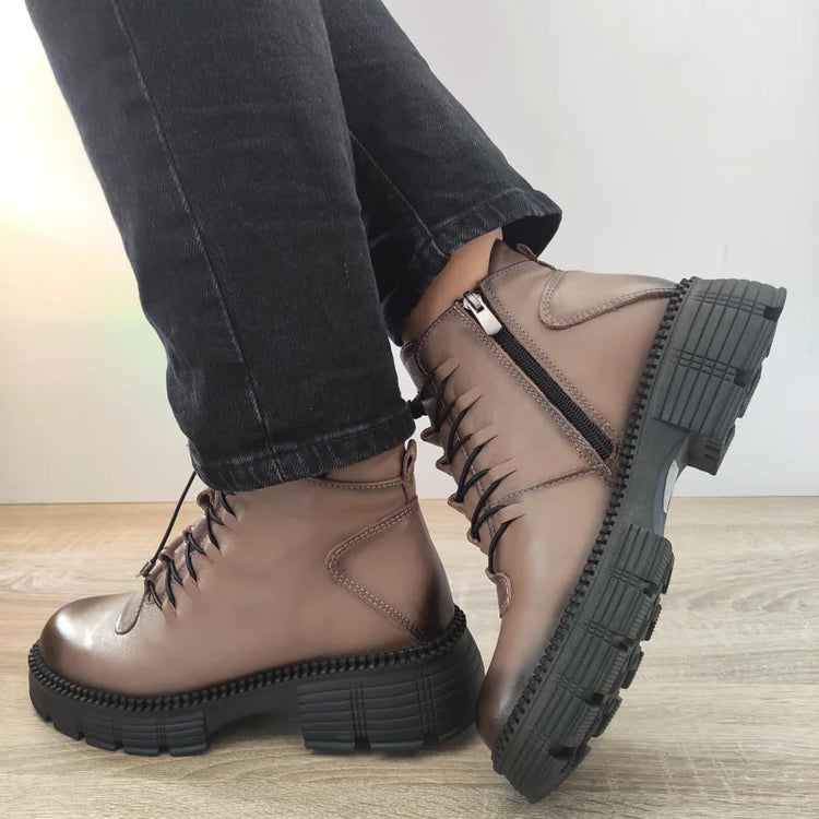 Ghete casual de damă marca Dogati, realizate din piele naturală, într-o nuanță elegantă de grej visone. Aceste ghete au un design compact și robust, ideal pentru un look modern de zi cu zi. Talpa groasă de 4.5 cm asigură confort și stabilitate, iar fermoarul lateral și șireturile frontale permit o încălțare rapidă și o potrivire sigură.