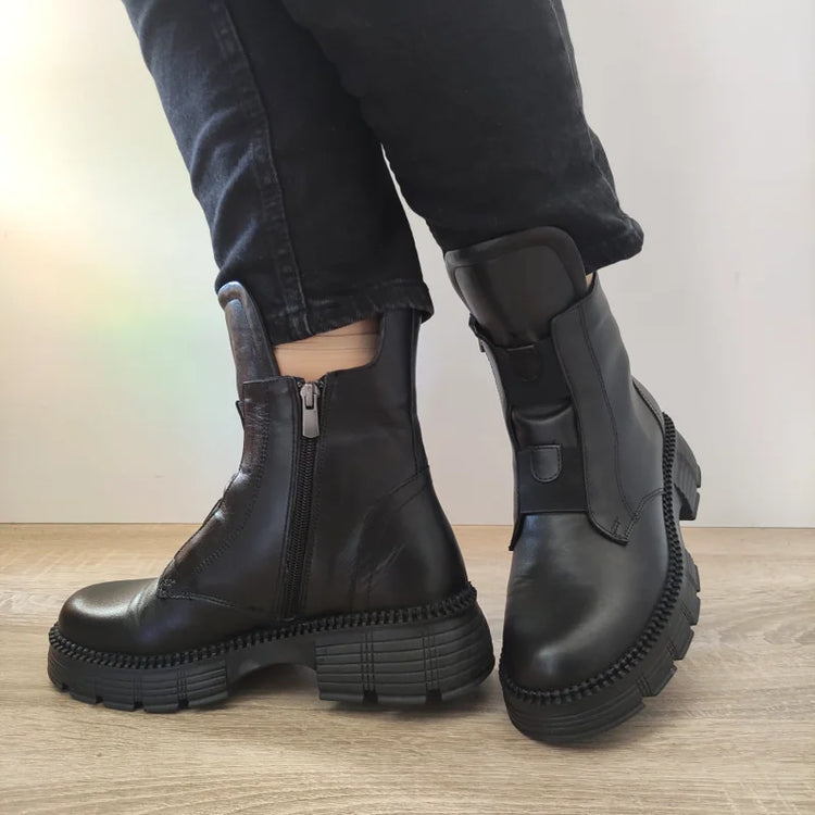Ghete casual de damă marca Dogati, confecționate din piele naturală de calitate superioară, în nuanța neagră. Aceste ghete au un design robust și modern, perfecte pentru a completa o ținută urbană. Cu o talpă groasă de 4.5 cm și un fermoar lateral pentru o încălțare ușoară, aceste ghete oferă confort și stabilitate.