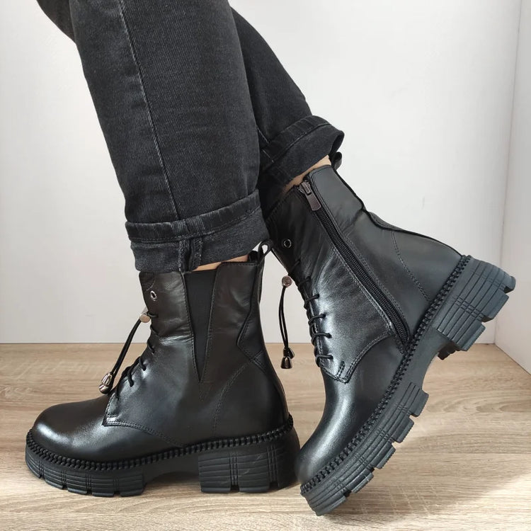 Descriere: Ghete casual de damă marca Dogati, realizate din piele naturală, în nuanța neagră, ideale pentru un stil modern și confortabil. Aceste ghete sunt dotate cu o talpă groasă de 4.5 cm pentru stabilitate și un fermoar lateral pentru o încălțare rapidă. Designul elegant și sistemul de șireturi cu detalii metalice le fac perfecte pentru un look urban îndrăzneț.