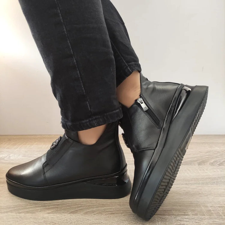 Descriere: Ghete casual de damă marca Dogati, realizate din piele naturală de calitate, în nuanța neagră. Aceste ghete combină stilul modern cu funcționalitatea, având o talpă de 4 cm care asigură confort pe durata întregii zile. Fermoarul lateral permite o încălțare facilă, făcându-le potrivite pentru un look urban și elegant.