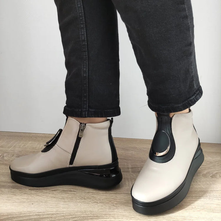 Descriere: Ghete casual de damă marca Dogati, confecționate din piele naturală, într-o combinație elegantă de bej vision și negru. Aceste ghete aduc un plus de stil oricărei ținute, fiind dotate cu o talpă înaltă de 4 cm și un detaliu decorativ modern în partea superioară. Fermoarul lateral facilitează încălțarea rapidă, făcându-le ideale pentru un look urban și sofisticat.