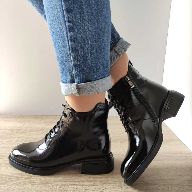 Aceste ghete casual negre de damă, realizate din piele naturală lăcuită, se remarcă prin aspectul lor elegant și versatil. Designul lacuit oferă un luciu atractiv, care le face potrivite pentru ținutele casual și smart-casual. Închiderea cu fermoar lateral permite o încălțare ușoară, iar șireturile adaugă un plus de ajustabilitate și stil. Talpa are o grosime de 4 cm, oferind un suport confortabil și stabil, în timp ce tocul aduce o înălțime suplimentară care adaugă un aspect feminin.