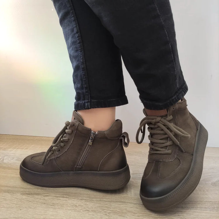 Descriere: Ghete casual de damă Formazione în culoarea kaki, realizate din piele naturală. Designul modern cu închidere cu fermoar lateral și șiret oferă un plus de stil și confort, ideale pentru ținutele de zi cu zi.