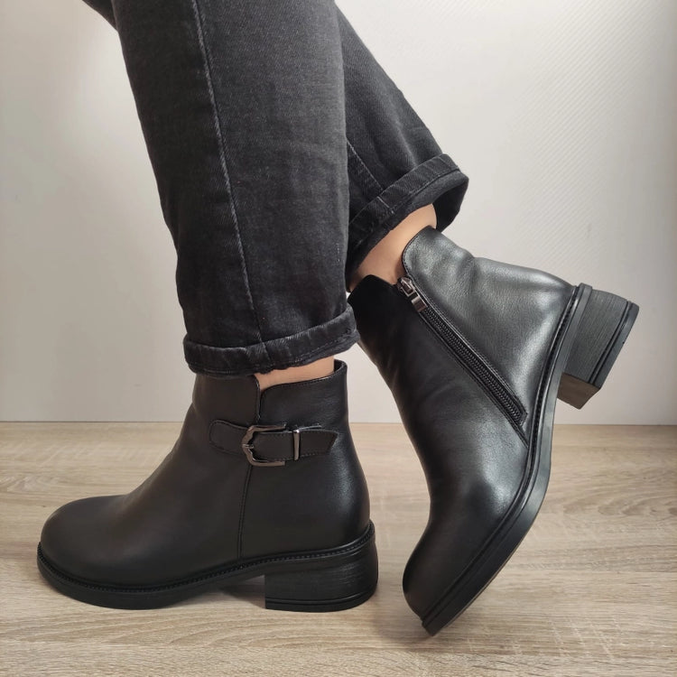 Descriere: Ghete casual pentru damă, marca Formazione, de culoare neagră, confecționate din piele naturală de înaltă calitate. Aceste ghete au un design elegant și sunt dotate cu fermoar lateral pentru o încălțare ușoară. Detaliul decorativ cu cataramă adaugă un plus de stil, iar înălțimea totală a ghetei este de 15.5 cm, oferind o protecție confortabilă pentru sezonul rece. Talpa de 4 cm asigură un confort sporit în utilizare.