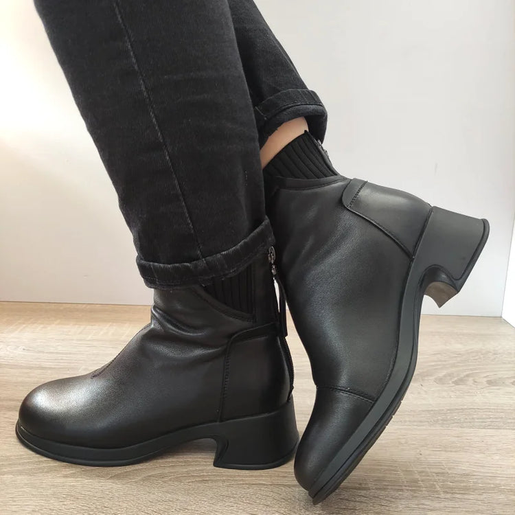 Descriere: Ghete casual de damă marca Formazione, confecționate din piele naturală combinată cu material textil, într-o nuanță clasică de negru. Aceste ghete sunt ideale pentru un look modern și confortabil, cu un toc de 4.5 cm care adaugă eleganță fără a compromite stabilitatea. Fermoarul lateral facilitează încălțarea rapidă, iar detaliile subtile din material textil adaugă un plus de stil.