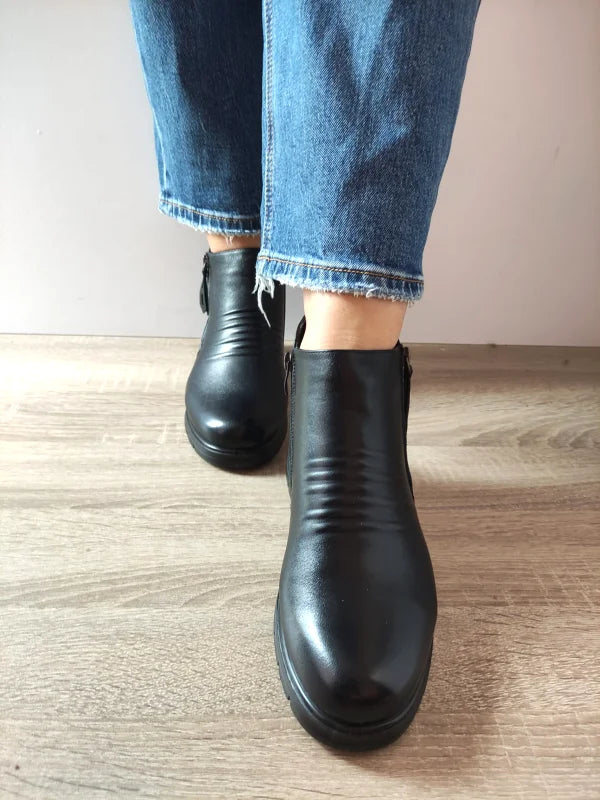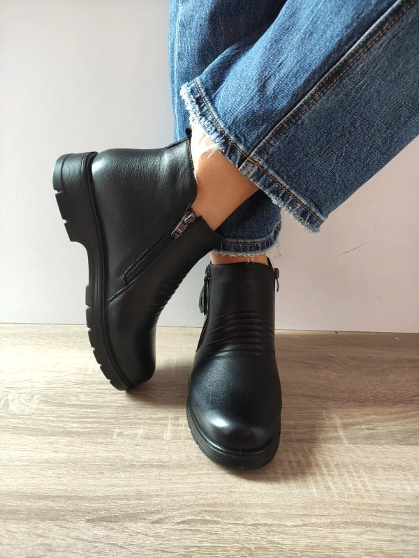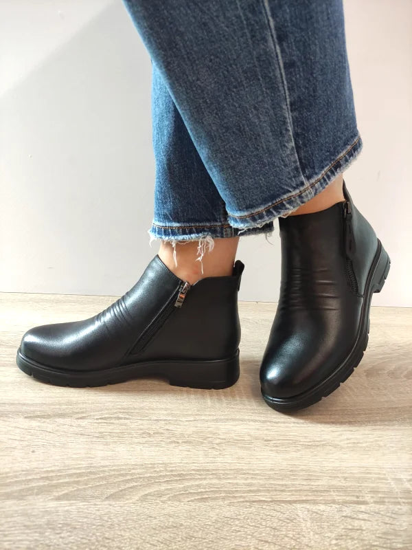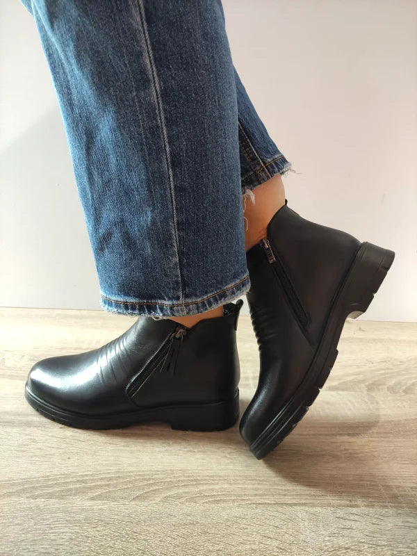 Descoperă eleganța practică a ghetelelor Formazione 76-76, realizate din piele naturală de înaltă calitate, într-o nuanță clasică de negru. Designul minimalist, completat de un fermoar lateral pentru încălțare ușoară, le face perfecte pentru femeile care apreciază confortul zilnic și stilul discret.