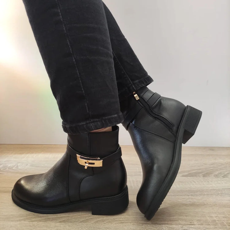 Descriere: Ghete casual de damă Formazione, confecționate din piele naturală de culoare neagră, cu un design elegant completat de o curea decorativă cu element metalic auriu în partea de sus. Aceste ghete sunt ideale pentru ținutele casual, oferind confort și stil pe tot parcursul zilei.