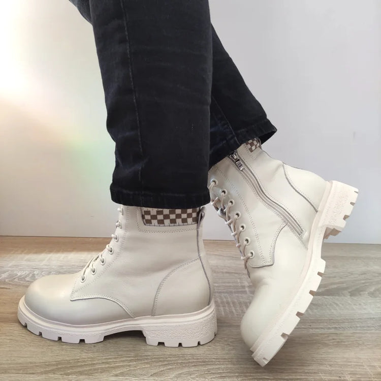 Descriere: Ghete casual de damă Formazione, realizate din piele naturală în nuanța crem, cu detalii interesante de tip șah pe partea superioară. Designul modern, combinat cu fermoarul lateral și șireturile, oferă un aspect urban și practic, perfect pentru sezonul rece.