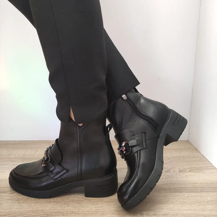 Descriere: Ghete casual de damă, model Marco Tozzi 25009-43, realizate din piele naturală de calitate superioară, cu un design modern și elegant. Aceste ghete negre sunt perfecte pentru sezonul rece, oferind atât confort, cât și un stil rafinat. Talpa cu toc de 5 cm adaugă un plus de înălțime, iar fermoarul lateral permite o încălțare ușoară și rapidă. Detaliul decorativ metalic din partea superioară completează aspectul elegant al ghetelor, adăugând un element distinctiv pentru orice ținută casual.