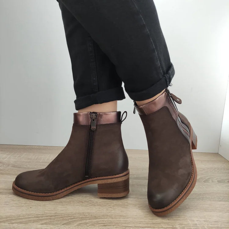 Descriere: Ghete casual de damă, model Marco Tozzi 25064-43, realizate din piele naturală nubuck și piele ecologică, într-o elegantă nuanță de maro. Aceste ghete sunt concepute pentru a oferi un look modern și confortabil în sezonul rece. Talpa cu toc de 5 cm asigură stabilitate și eleganță, iar fermoarul lateral facilitează o încălțare rapidă. Designul simplu și rafinat, completat de detalii subtile, face ca aceste ghete să fie o alegere versatilă și practică, potrivită pentru diverse ținute casual.