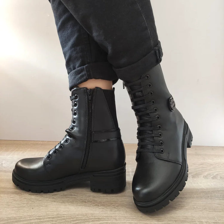 Descriere: Ghete casual de damă, model Nicolis 31027, realizate din piele naturală de calitate, într-o nuanță clasică de negru. Aceste ghete sunt ideale pentru un stil modern și practic, oferind confort și protecție în sezonul rece. Talpa robustă cu toc de 5 cm asigură stabilitate, iar fermoarul lateral facilitează o încălțare rapidă și ușoară. Designul cu șireturi și detalii subtile adaugă un plus de stil, făcându-le o alegere excelentă pentru ținutele casual de zi cu zi.