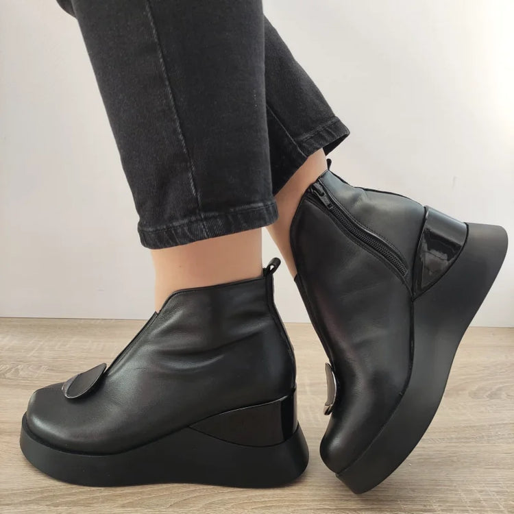 Descriere: Ghete casual din piele naturală, cu un design modern și detalii distinctive, potrivite pentru un look deosebit. Platforma înaltă oferă un plus de confort și stil, fiind ideale pentru a completa o ținută sofisticată și confortabilă.