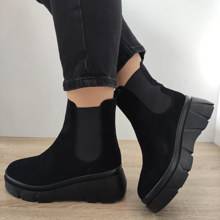 Descriere: Ghete casual din piele naturală întoarsă, cu un design modern și platformă robustă, ideale pentru un stil îndrăzneț și confortabil. Sistemul slip-on cu elastic asigură o potrivire ușoară și o susținere excelentă, perfectă pentru o ținută de zi cu zi în sezonul rece.