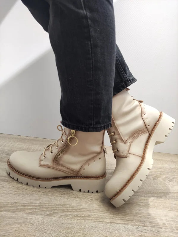 Rafinate și moderne, aceste ghete casual Pikolinos W6S-8619 din piele naturală bej marfil sunt alegerea ideală pentru femeile care apreciază calitatea premium și designul aparte. Detaliile aurii cu fermoar lateral și șireturi, alături de aplicațiile metalice discrete, transformă acest model într-o piesă elegantă și versatilă.