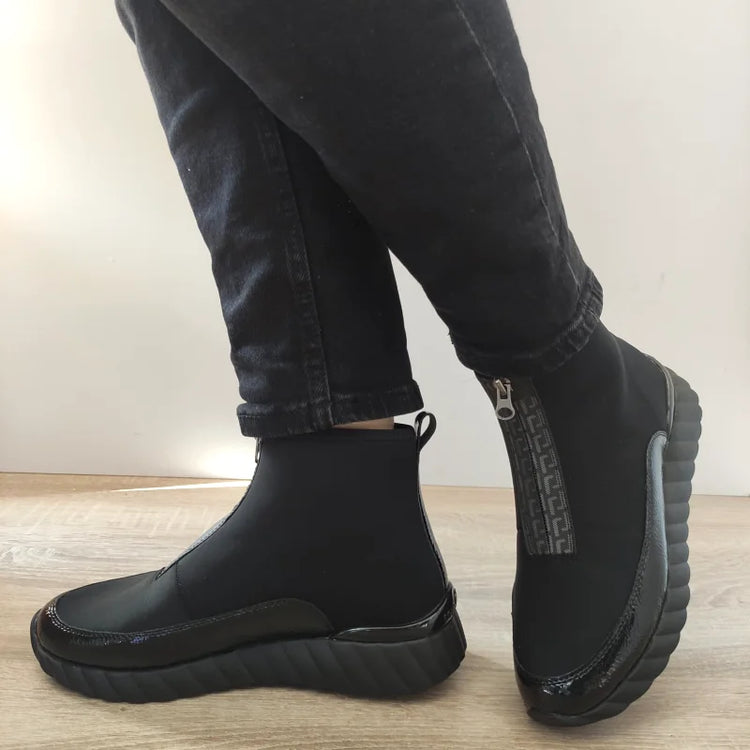 Descriere: Ghete casual din material textil și piele ecologică, cu un design modern și platformă confortabilă. Aspectul minimalist și detaliile lucioase adaugă un plus de eleganță, fiind perfecte pentru a completa o ținută urbană.