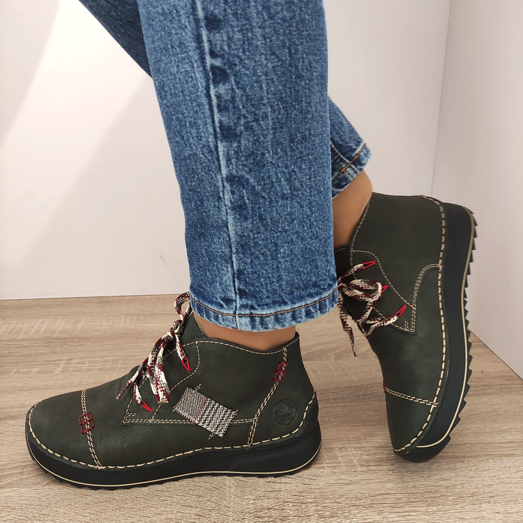 Ghete casual pentru damă, confecționate din piele ecologică de înaltă calitate, care oferă durabilitate și un aspect estetic plăcut. Închiderea cu șireturi permite o ajustare perfectă pe picior, garantând confort pe tot parcursul zilei. Cu o grosime a tălpii de 3 centimetri, aceste ghete combină eleganța fără toc cu un plus de înălțime. Având o înălțime totală a pantofului de 12 centimetri, aceste ghete sunt perfecte pentru orice ținută casual. Cod produs: RIEKER 51534-54. Eleganță și confort în fiecare pas!