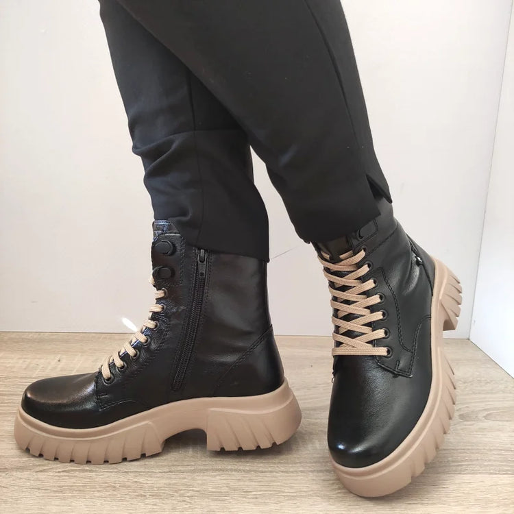 Descriere: Ghete casual din piele ecologică, cu un design modern și robust, potrivite pentru un look îndrăzneț în sezonul rece. Talpa masivă și șireturile contrastante oferă un aspect unic, iar fermoarul lateral asigură o încălțare ușoară și rapidă.